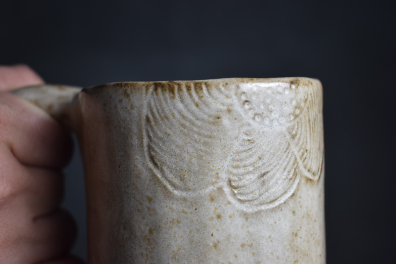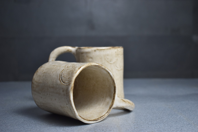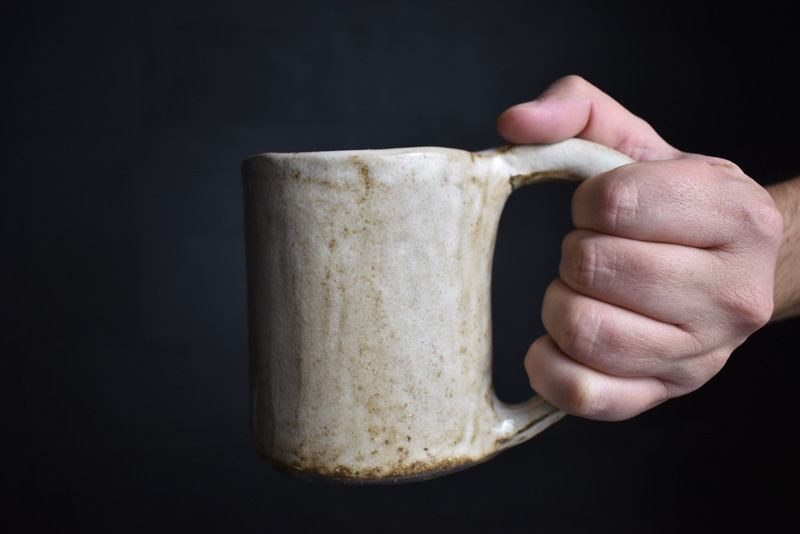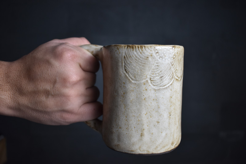 Tazón modelado a mano con pasta negra y en contraste con esmalte crema. La forma del asa rescata el gesto de tomarla con gran firmeza. Tiene un sutil decorado con incisas. Pieza apta para microondas y lavavajilla